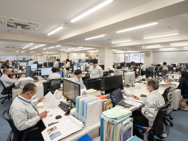 JR宇都宮駅から徒歩15分の立地、駅東の閑静な環境に本社がある。執務室は道路・橋梁・河川など部署ごとにゾーンが分かれている。